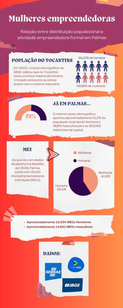 Apesar das mulheres representarem mais de 50% da população de Palmas, no final de 2024, a capital contava com aproximadamente 25.105 microempreendedores individuais (MEIs) registrados. Sendo 10.252 empreendedoras do sexo feminino formalizadas na cidade, o que representa cerca de 40,84% do total.